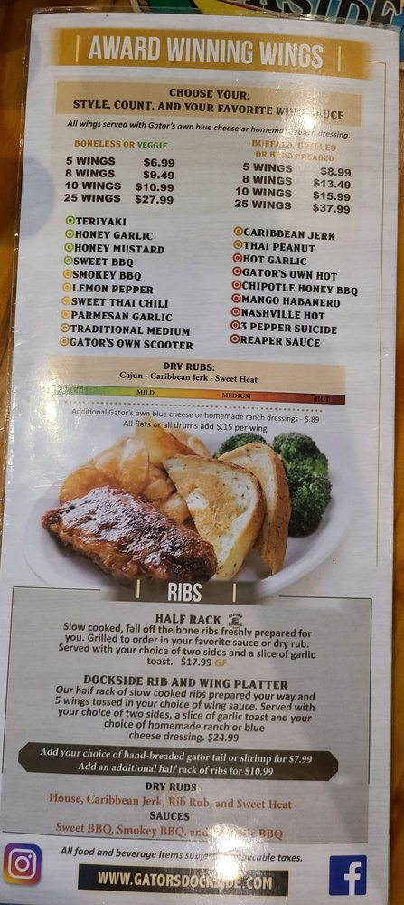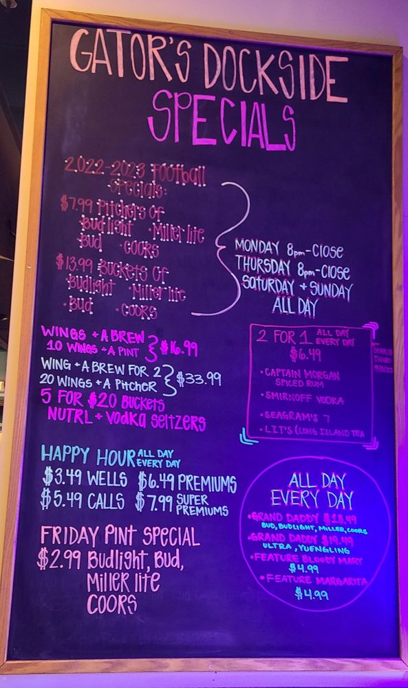 With a full bar, happy hour specials, and a commitment to cleanliness, Gator's Dockside is the go-to place for good meals and great company. Come experience the local flavor and hospitality that will surely keep you coming back for more!